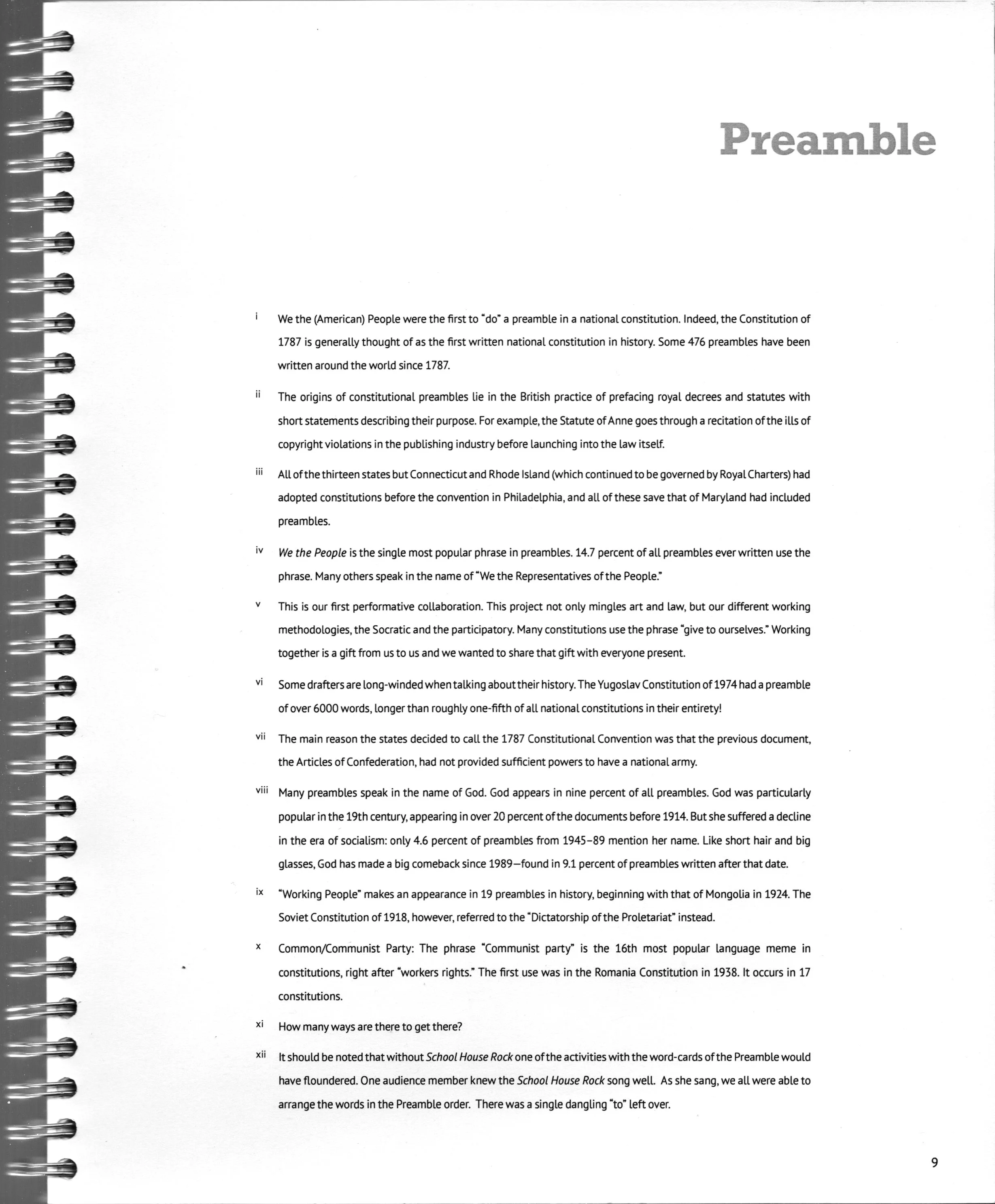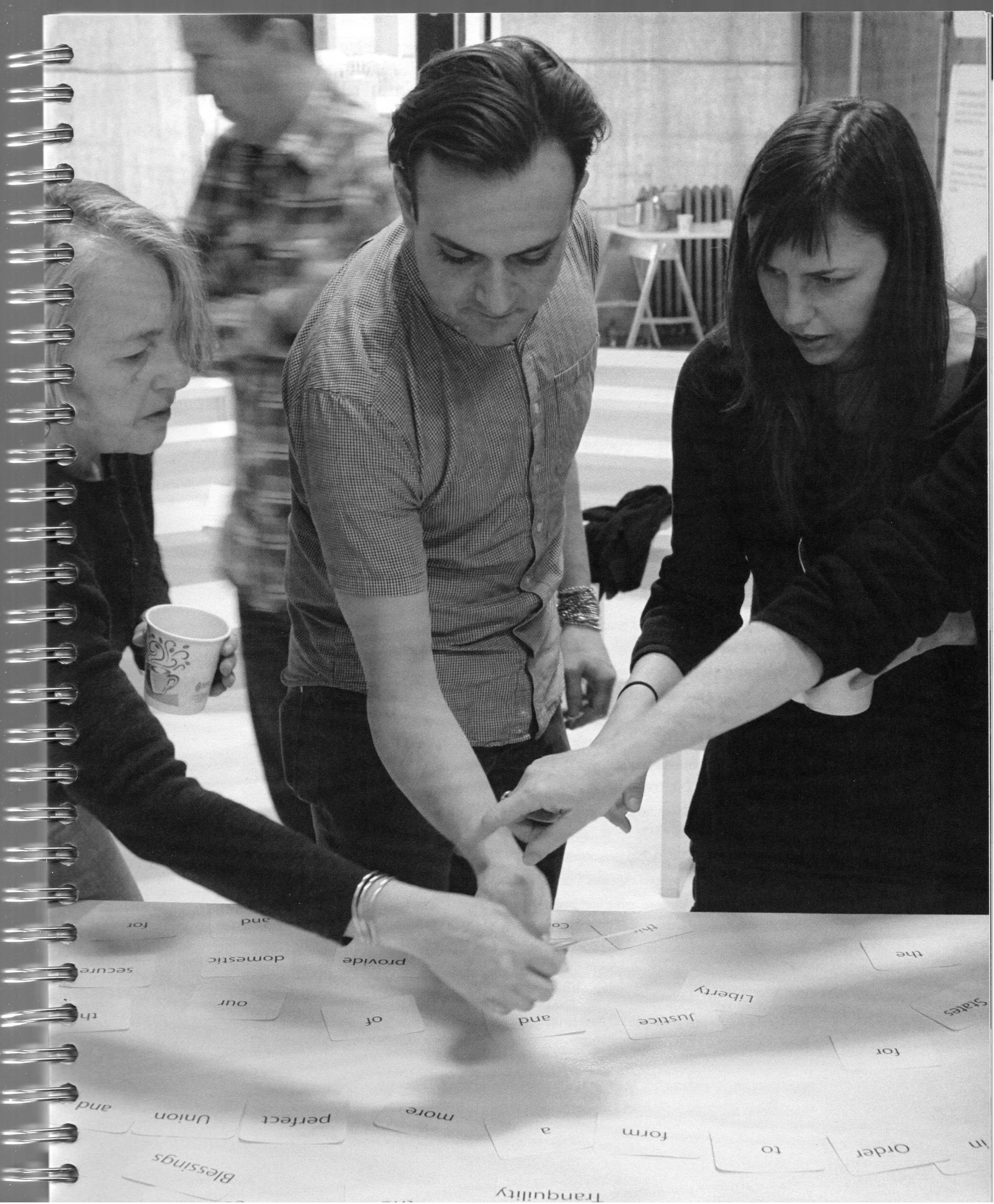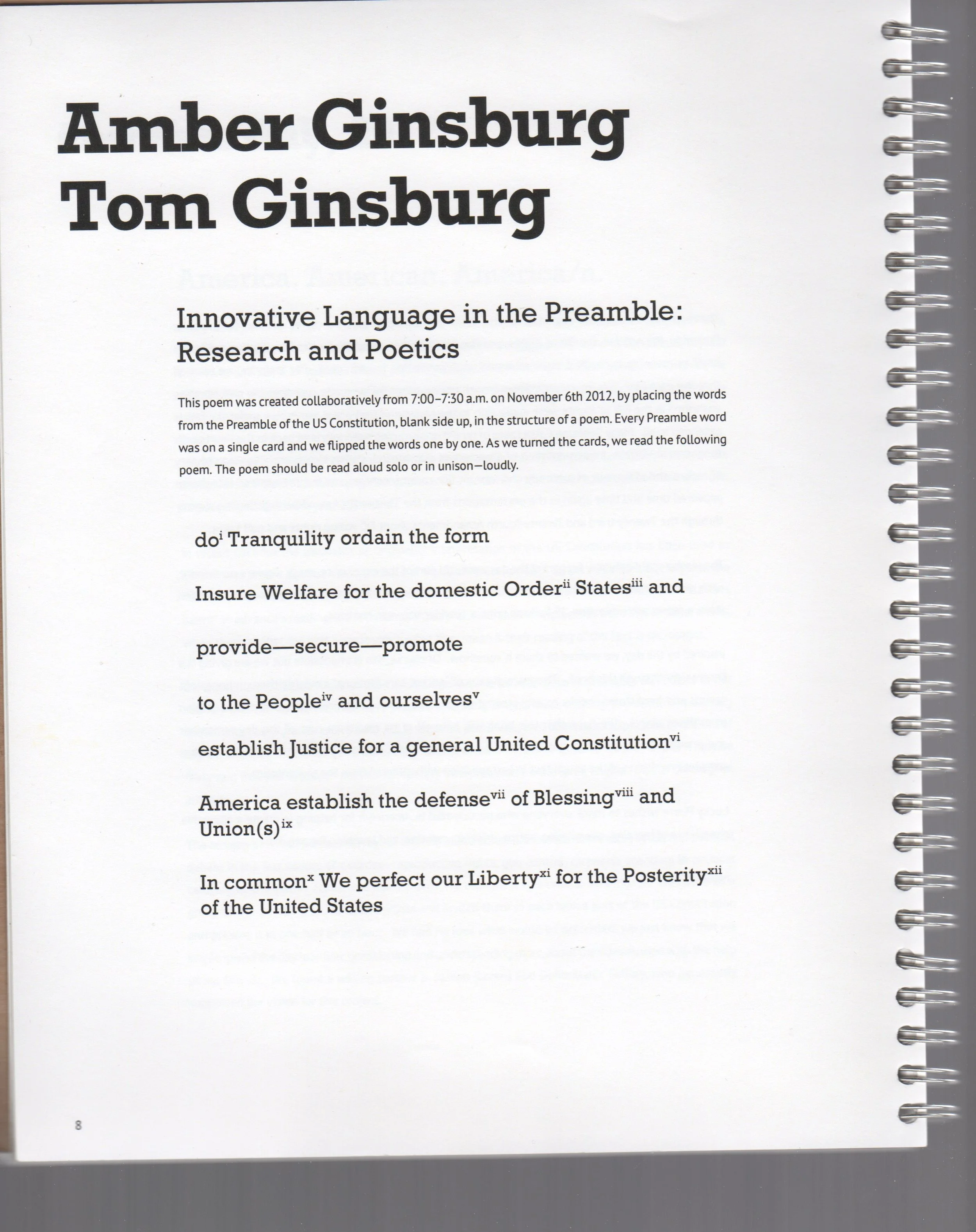 On invitation from Lucky Pierre to join a 12 hour presentation about the U.S. Constitution on election day 2012, Tom Ginsburg and I collaborated for the first time, choosing to focus on the preamble. For the live performance, Tom spoke about the history and aspirations of preambles in the lives of constitutions, and at three separate times, I worked with the audience to make poems from extracted words of the preamble. For the publication, we created a highly annotated poem combining the group process with research.